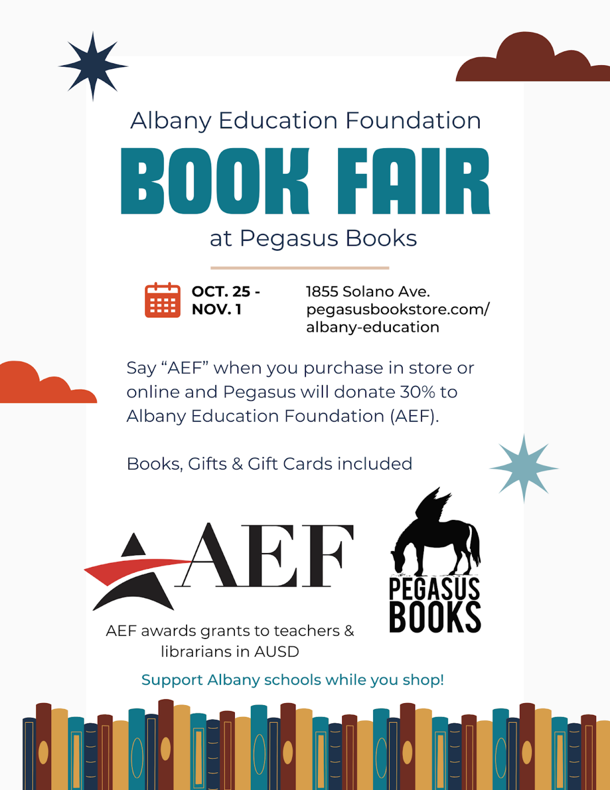 Support Albany schools while you shop at Pegasus Books! Albany Education Foundation (AEF) is having a book fair fundraiser at Pegasus Books on Solano Ave. starting Saturday. From October 25 through November 1, Pegasus will donate 30% of all sales when you mention "AEF" at checkout. Do you have friends and family who live out of town who would like to support our schools? Direct them to pegasusbookstore.com/albany-education during the AEF Book Fair and be sure to type "AEF" at checkout. All purchases at Pegasus qualify — books, gifts, gift cards, etc. If you would like to purchase a book for a classroom or library, Pegasus has lists — both in store and online — of requested books for each AUSD school. The AEF Pegasus Book Fair helps fund future AEF grants for teachers while supporting a valued local bookstore. Thank you!
